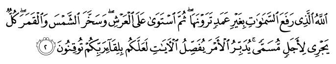 Allah jualah yang menjadikan langit terangkat tinggi dengan tiada bertiang sebagaimana yang kamu melihatnya, kemudian Ia bersemayam di atas Arasy; dan Ia memudahkan matahari dan bulan (untuk faedah makhluk-makhlukNya) tiap-tiap satu dari keduanya beredar untuk suatu masa yang telah ditetapkan. Allah jualah yang mentadbirkan segala urusan; Ia menerangkan tanda-tanda kekuasaanNya satu-persatu, supaya kamu yakin kepada pertemuan Tuhan kamu (untuk menerima balasan).
