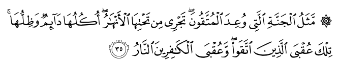 The parable of the Garden which the righteous are promised!- beneath it flow rivers: perpetual is the enjoyment thereof and the shade therein: such is the end of the Righteous; and the end of Unbelievers in the Fire.